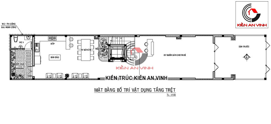 Tầng 1 : Khu vực cho thuê kinh doanh, phòng bếp, vệ sinh.
