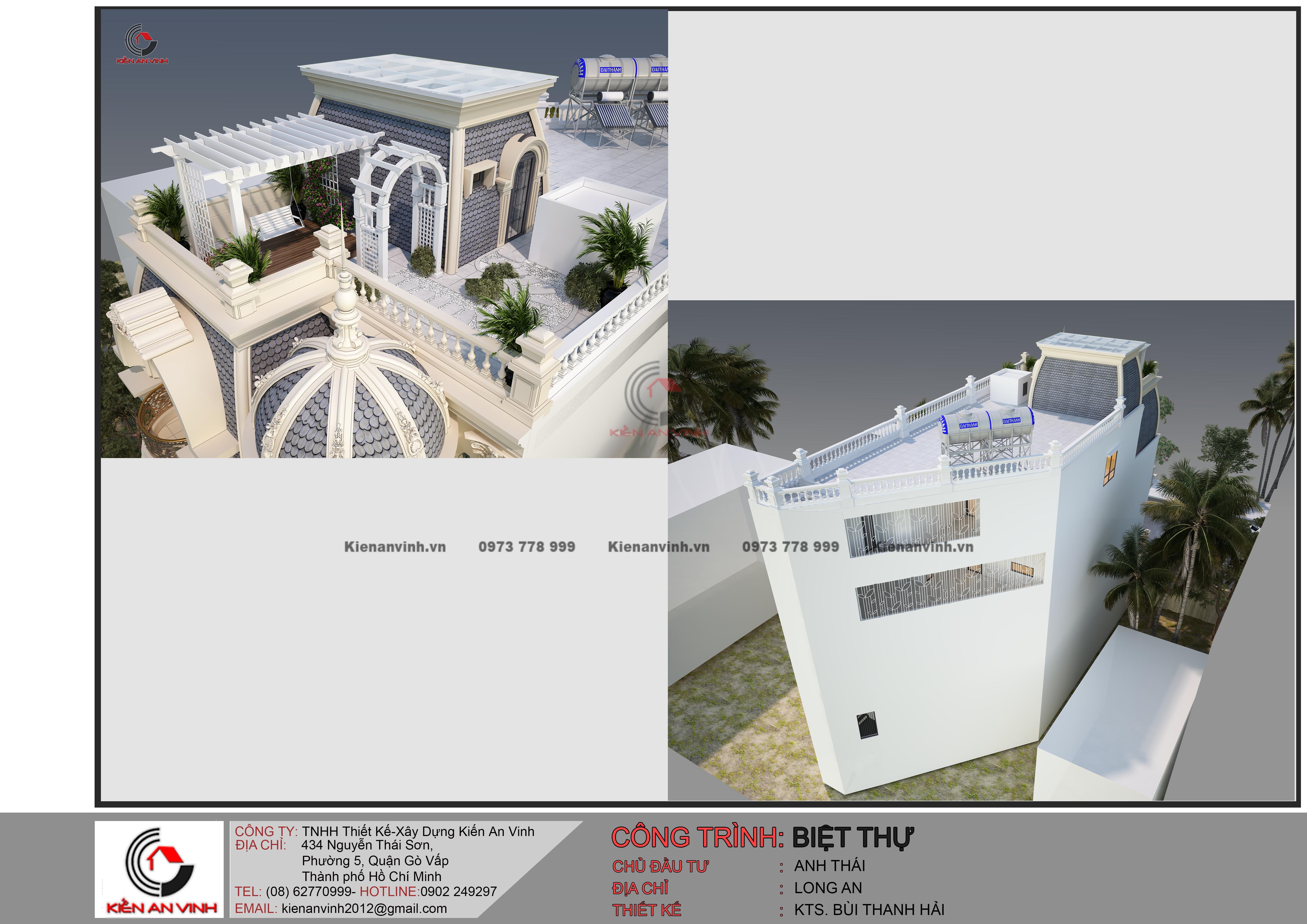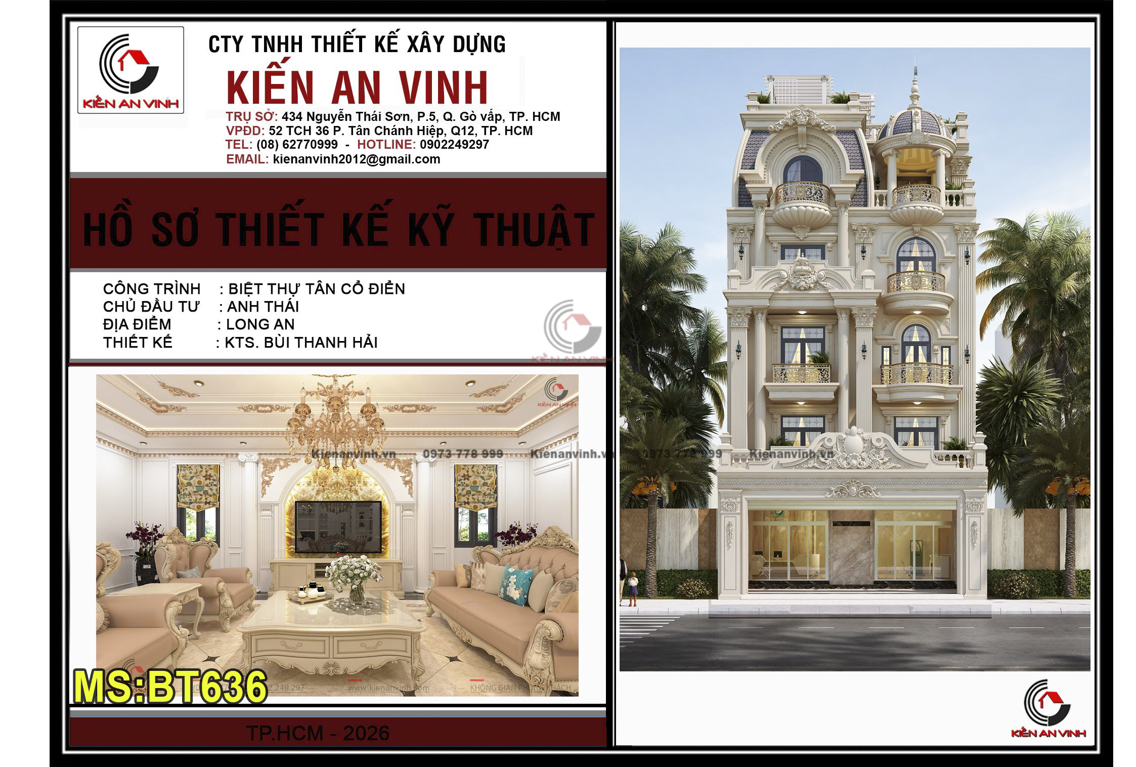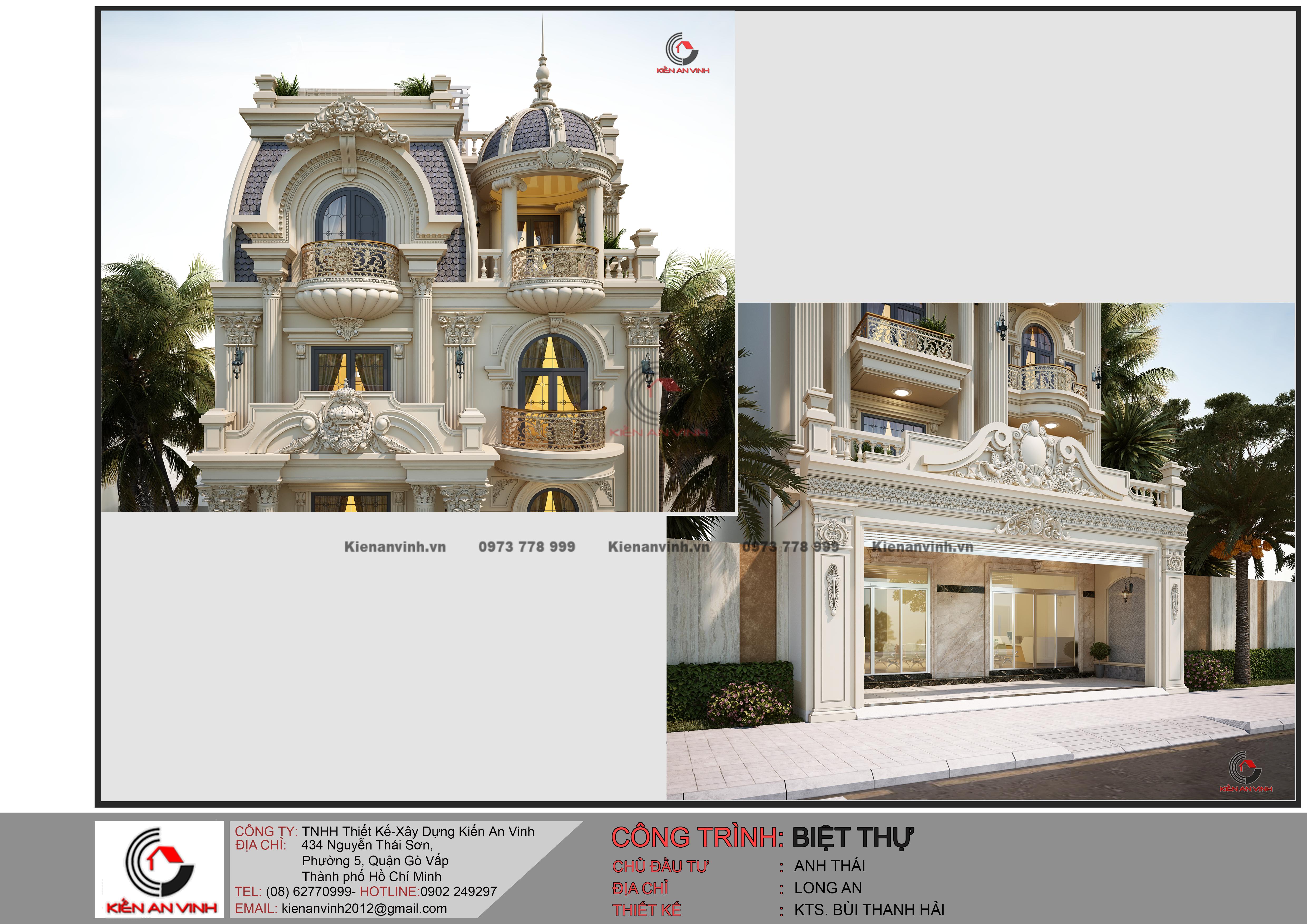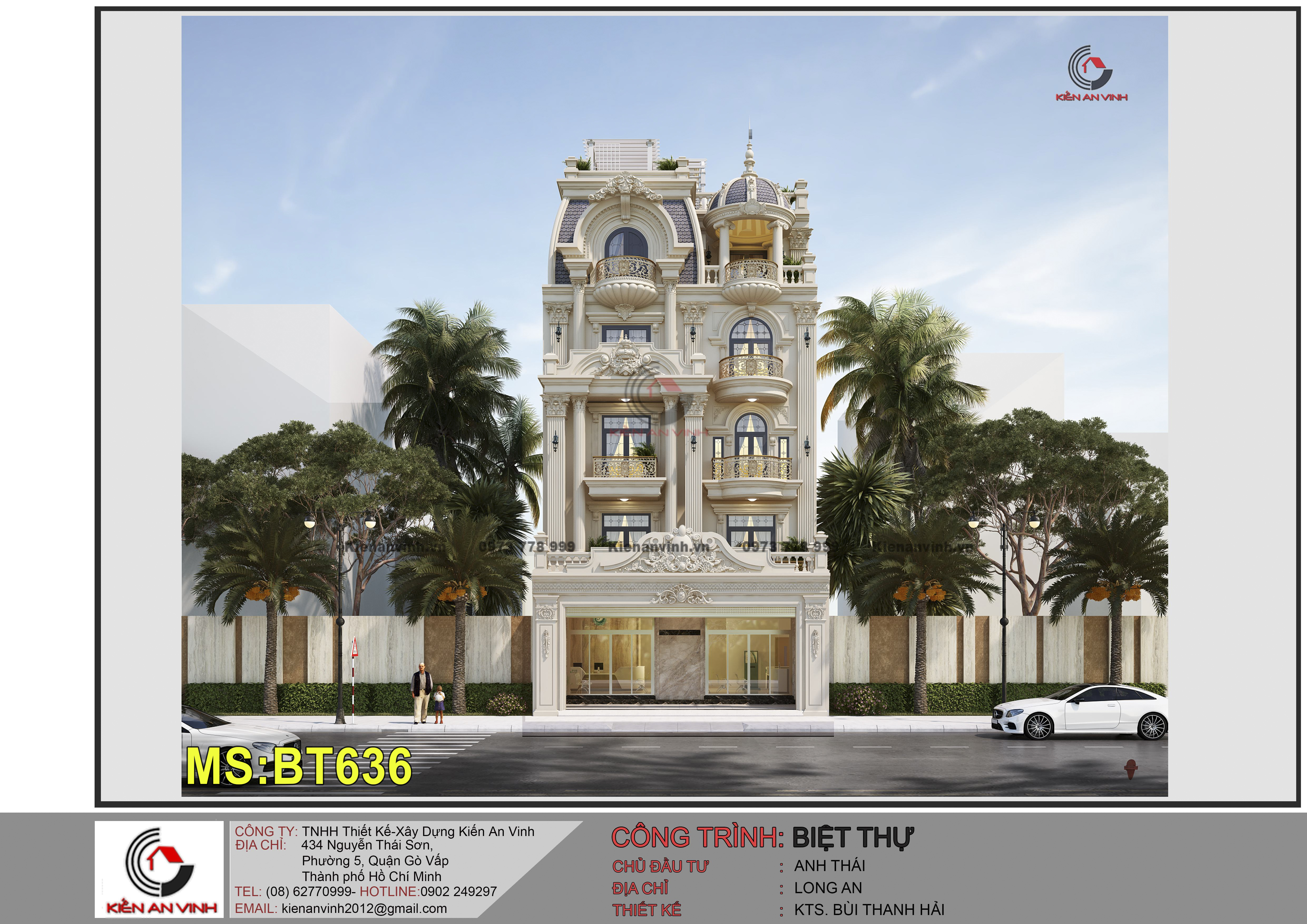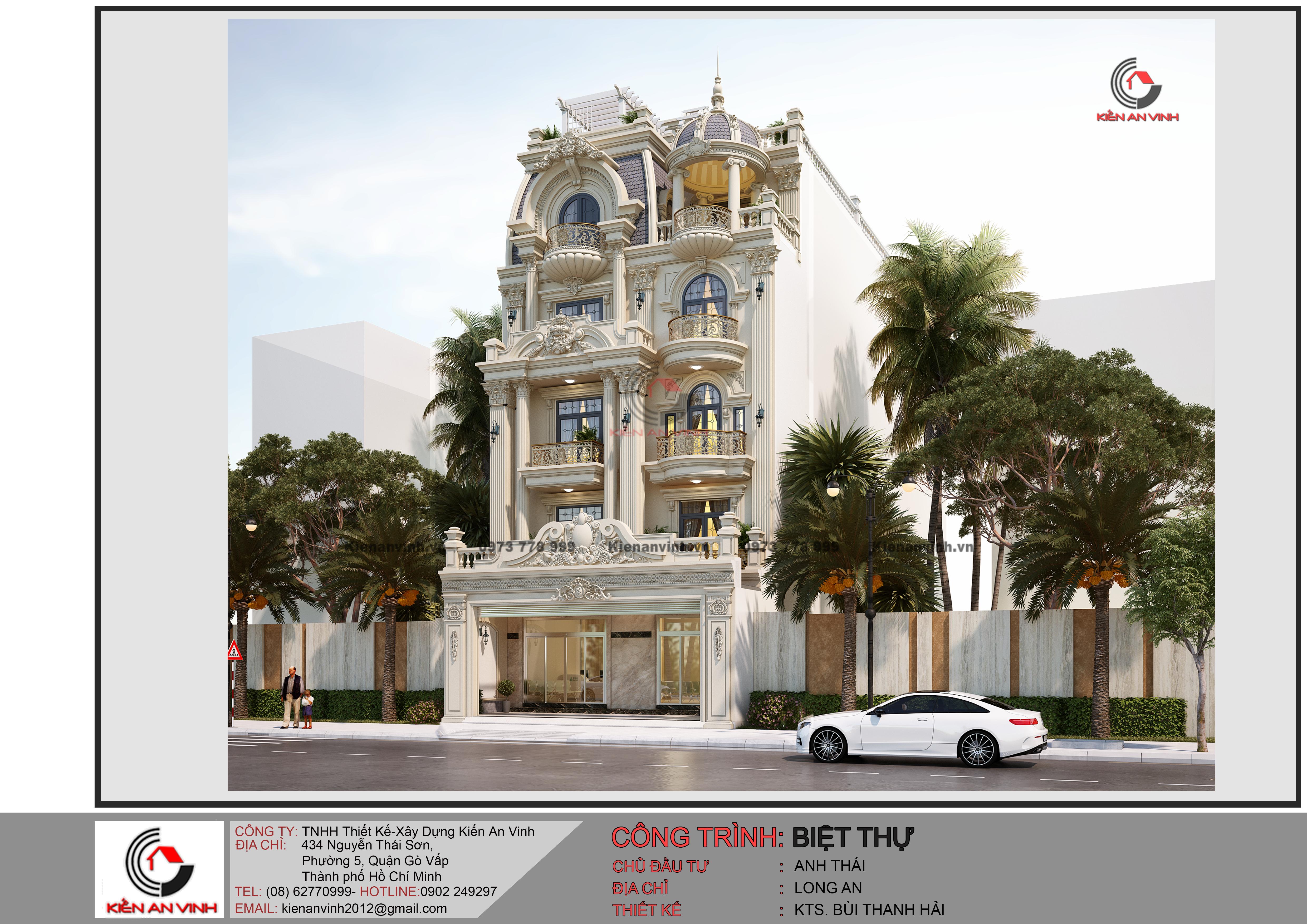 Dự án do Kiến An Vinh thiết kế cho gia chủ tại Long An, với quy mô 5 tầng hoành tráng, nổi bật giữa khu phố.