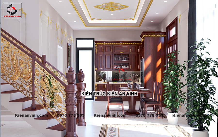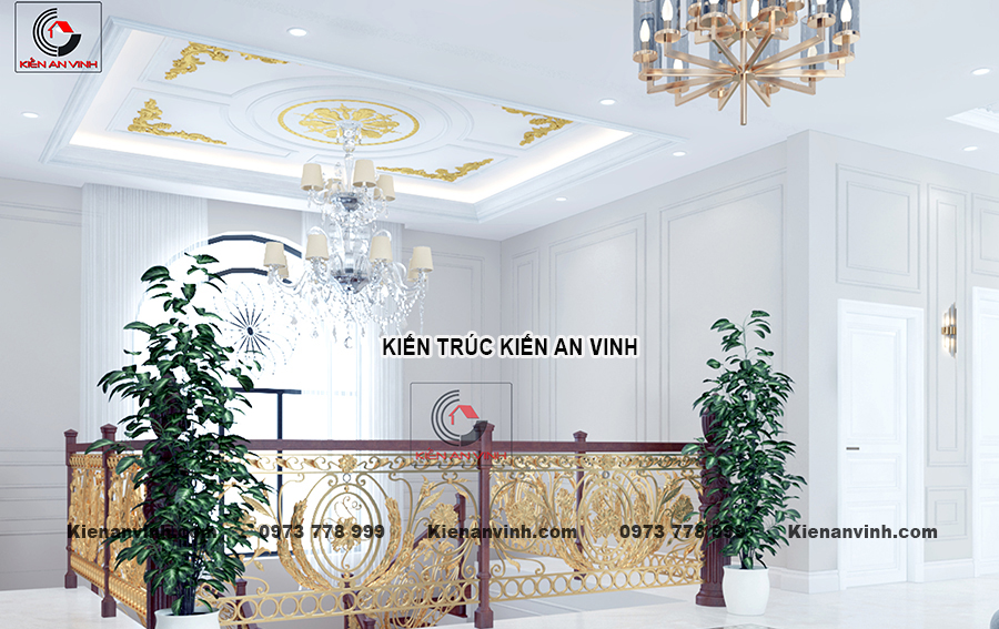 Kiến trúc thiết kế loại bỏ các hoa văn trên thành tưởng cũng như mái giúp vừa mang nét đẹp của một mẫu biệt thự 2 tầng đơn giản. Bên cạnh đó còn giúp gia chủ tiết kiệm được tối đa chi phí thiết kế cũng như phần xây dựng. Phần ban công ở khu vực tầng 2 được chừa với diện tích khá rộng, mang lại sự thoải mái tuyệt đối cho người dùng. Để giúp khu vực này an toàn cho người dùng, kiến trúc sư đã thiết kế phần lang cang ấn tượng. Với họa tiết uốn lượn mạ đồng, vừa giúp khu vực này vừa an toàn mà lại mang lại nét đẹp cuốn hút với gam màu vàng đồng.
