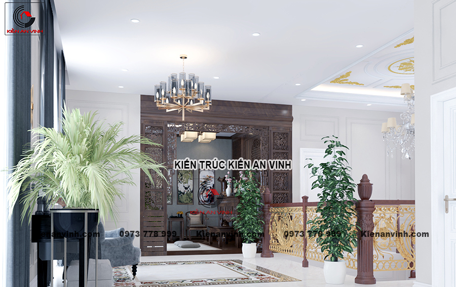 Khối betong nằm giữa được thiết kế phần kính kéo dài từ tầng một đến tầng 2. Giúp biệt thự càng tôn lên được nét đẹp đặc trưng của một mẫu biệt thự tân cổ điển. Quan sát ở khu vực tầng cao nhất tại khu vực ban công. Có thể thấy phần lam chắn được bố trí làm mái che cho khu vực này. Vừa giúp biệt thự mang nét đẹp mới mẻ và tiện lợi khi sử dụng.
