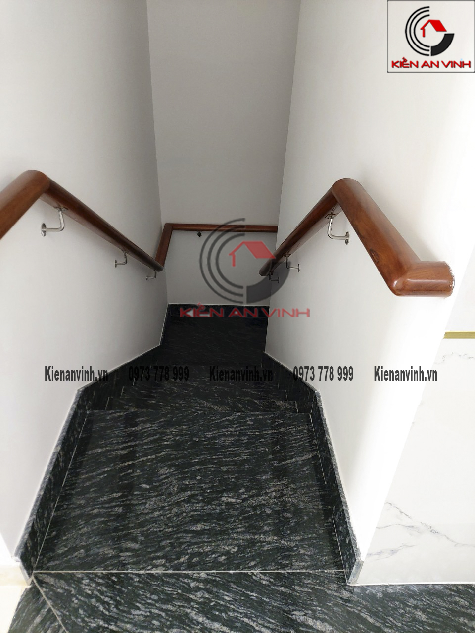 - Sàn gạch bóng kiếng 80×80, cầu thang đá granite đen tia chớp kết hợp tay vịn gỗ lim cao cấp.