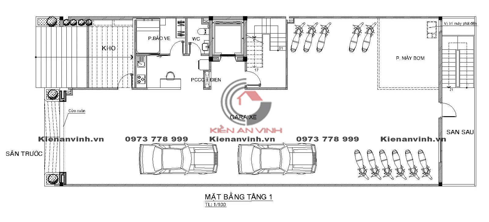 - Tầng 1 (Gara và Sảnh lễ tân): Dành riêng cho gara đỗ xe ô tô và xe máy (khoảng 20 chỗ), kết hợp sảnh lễ tân rộng 50m² với quầy bar nhỏ. Thiết kế mở với cửa kính tự động, dễ dàng tiếp cận từ đường chính. Khu vực này còn có phòng vệ sinh công cộng và kho chứa đồ, giúp giảm tải cho các tầng trên.
