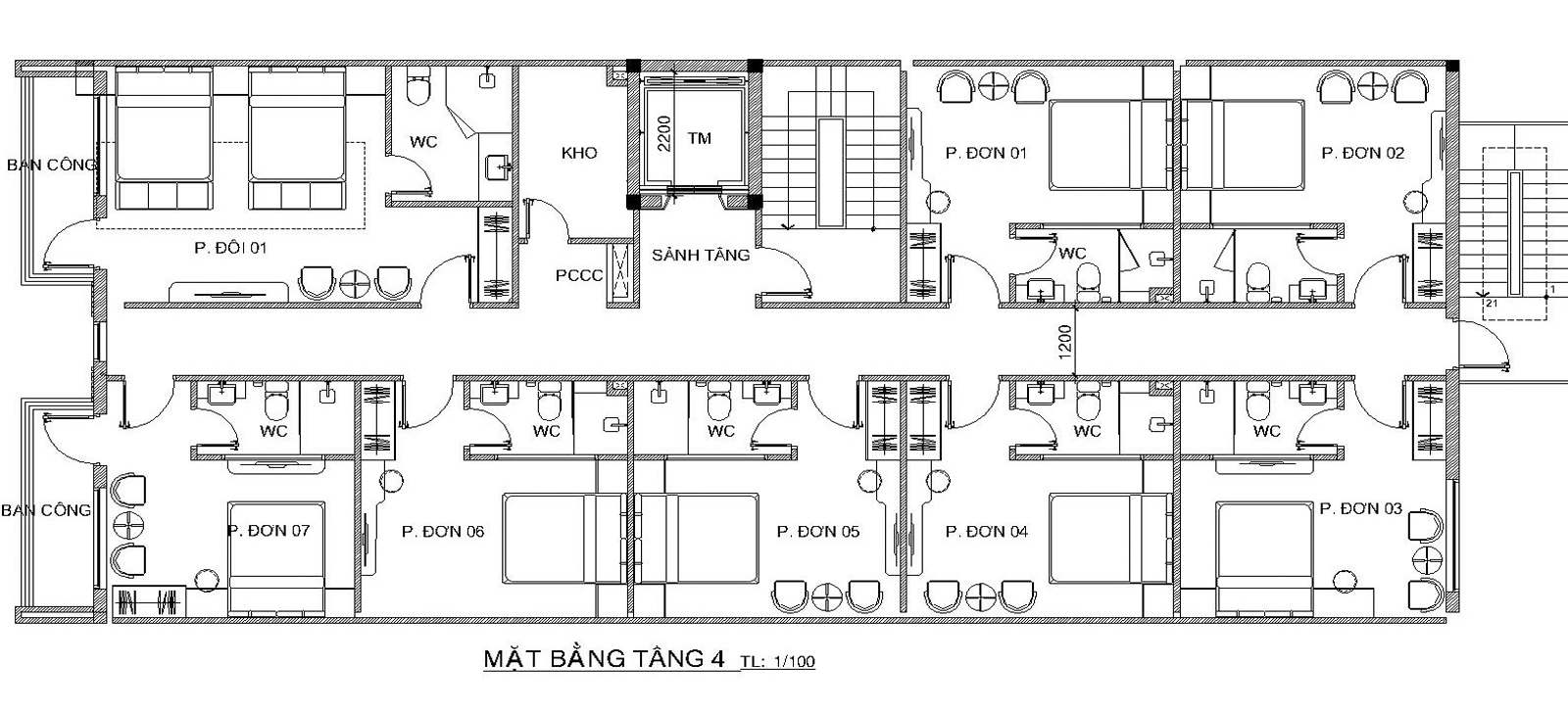 - Tầng 4 và 5 (Phòng tiêu chuẩn): Mỗi tầng có 8 phòng đôi và đơn (20m²/phòng), với WC riêng biệt, tủ lạnh mini và WiFi tốc độ cao. Thiết kế thông gió tự nhiên qua cửa sổ lớn, tiết kiệm điện năng lên đến 30%.