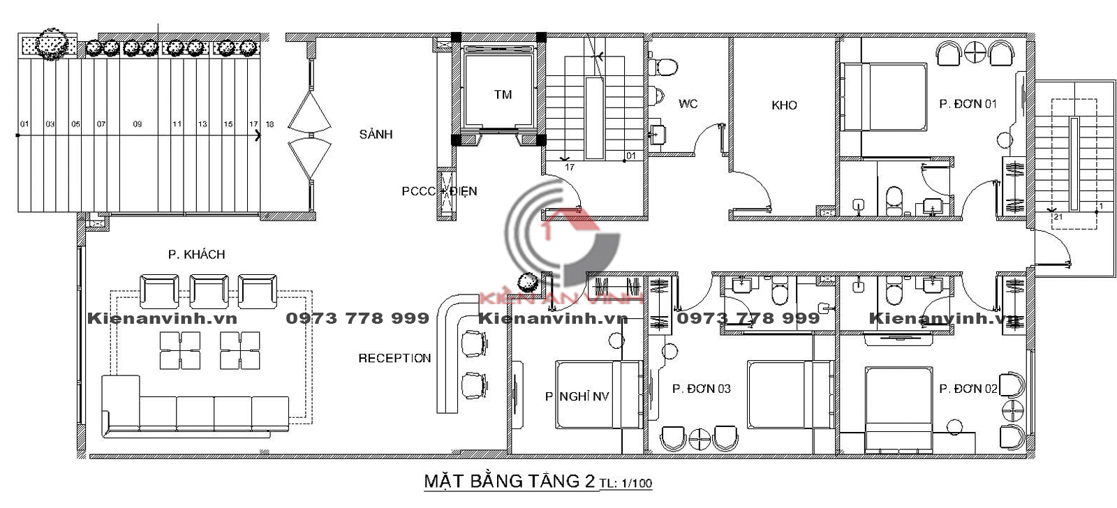 - Tầng 2 (Phòng hành chính và Ăn uống): Tập trung vào chức năng hỗ trợ kinh doanh, với reception chính, khu ăn sáng (buffet cho 50 khách), và 4 phòng nghỉ tiêu chuẩn. Bố trí thang máy ở trung tâm giúp di chuyển nhanh chóng, chỉ mất 30 giây từ gara lên phòng.
