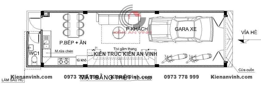 Tầng 1 : gara, Phòng Khách, Phòng Bếp + Ăn, Vệ sinh.