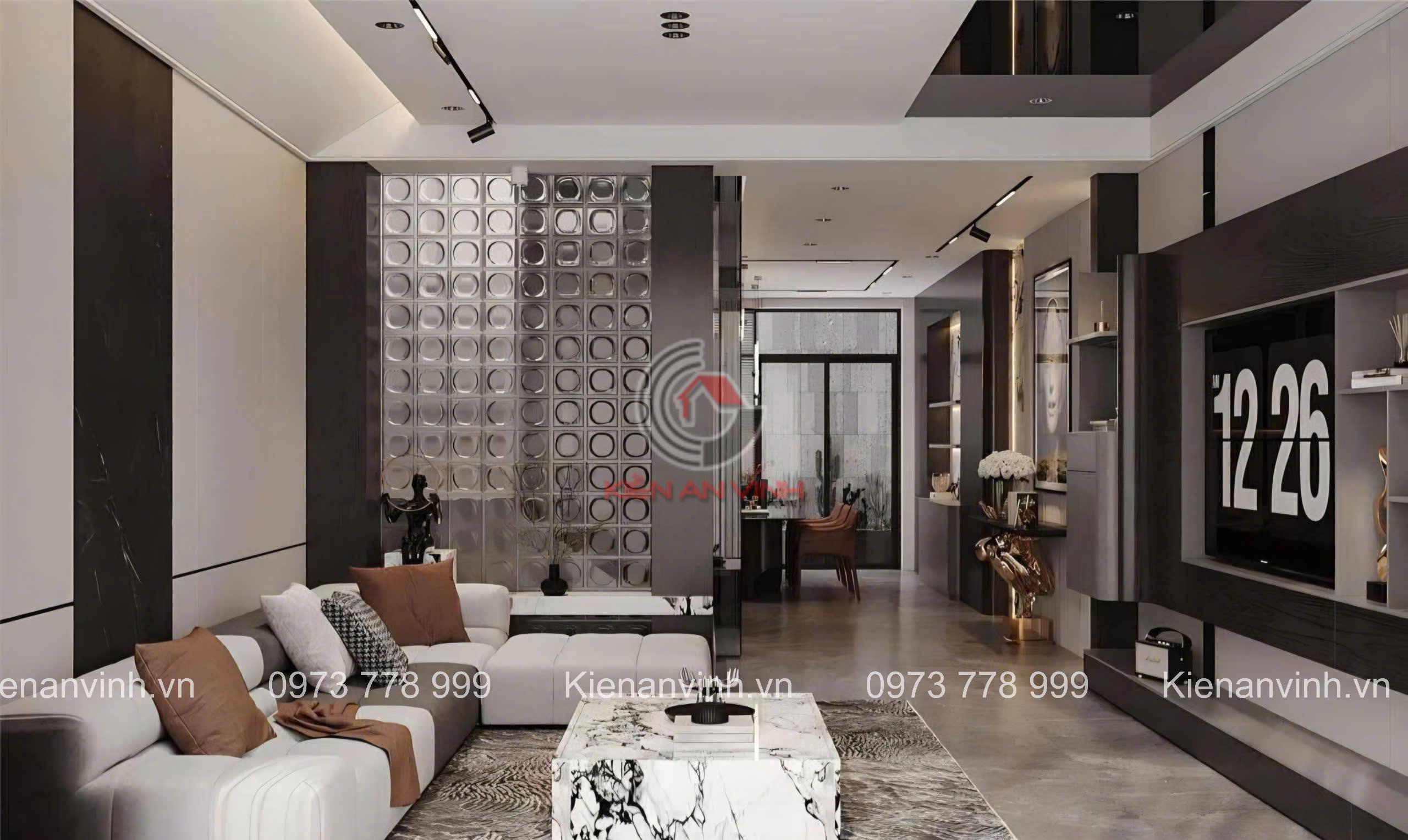 Mẫu nhà mà Kiến An Vinh thực hiện lần này phù hợp với lô đất phố tiêu chuẩn.Với phong cách hiện đại tối giản, ngôi nhà sử dụng tông màu trắng xám chủ đạo, kết hợp kính cường lực và gỗ tự nhiên để tạo cảm giác thoáng đãng, gần gũi.