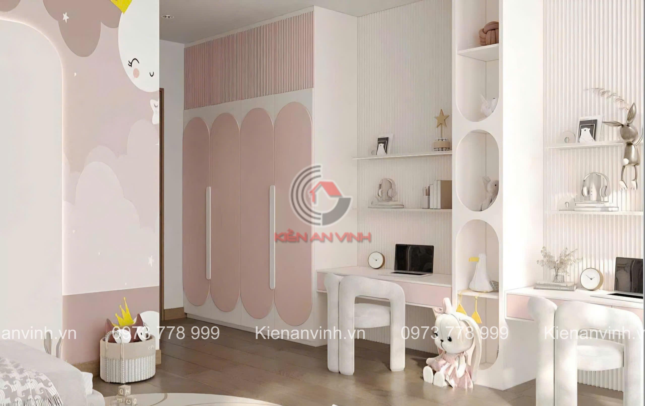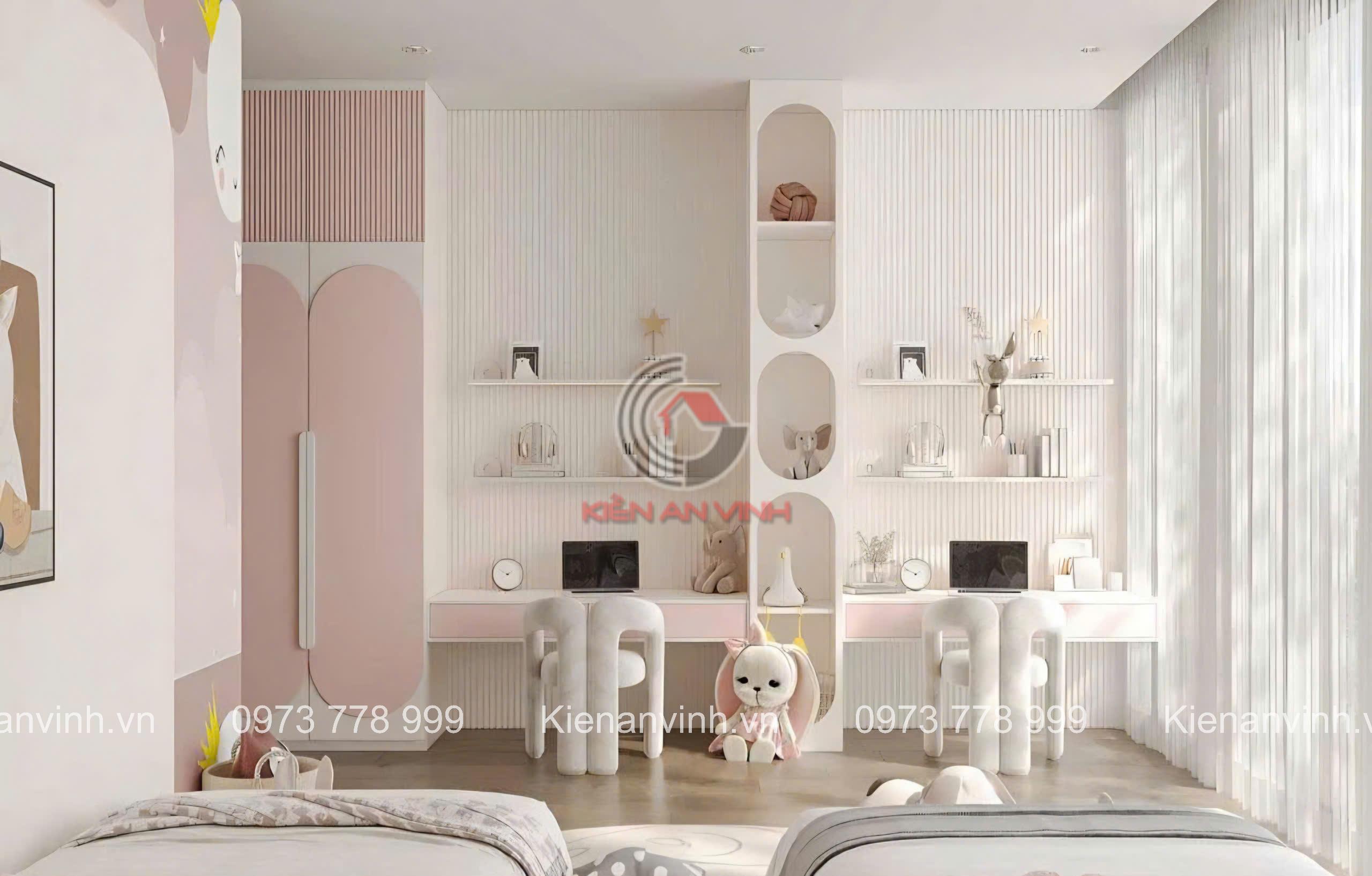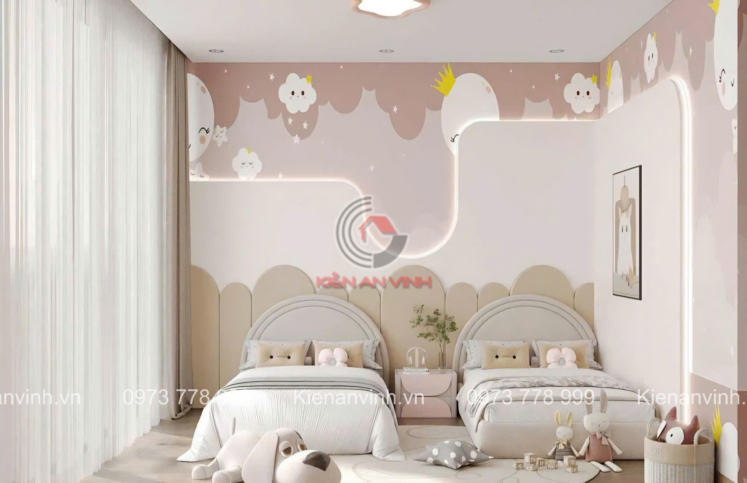 Phòng rẻ em sử dụng tông màu pastel, giường đôi với đầu giường uốn cong, và tường trang trí mây cùng đèn LED ẩn.Thiết kế sinh động với màu sắc tươi sáng, bố trí hợp lý cho góc học tập và khu vui chơi. Sử dụng nội thất an toàn, bo góc mềm mại để bảo vệ trẻ nhỏ.