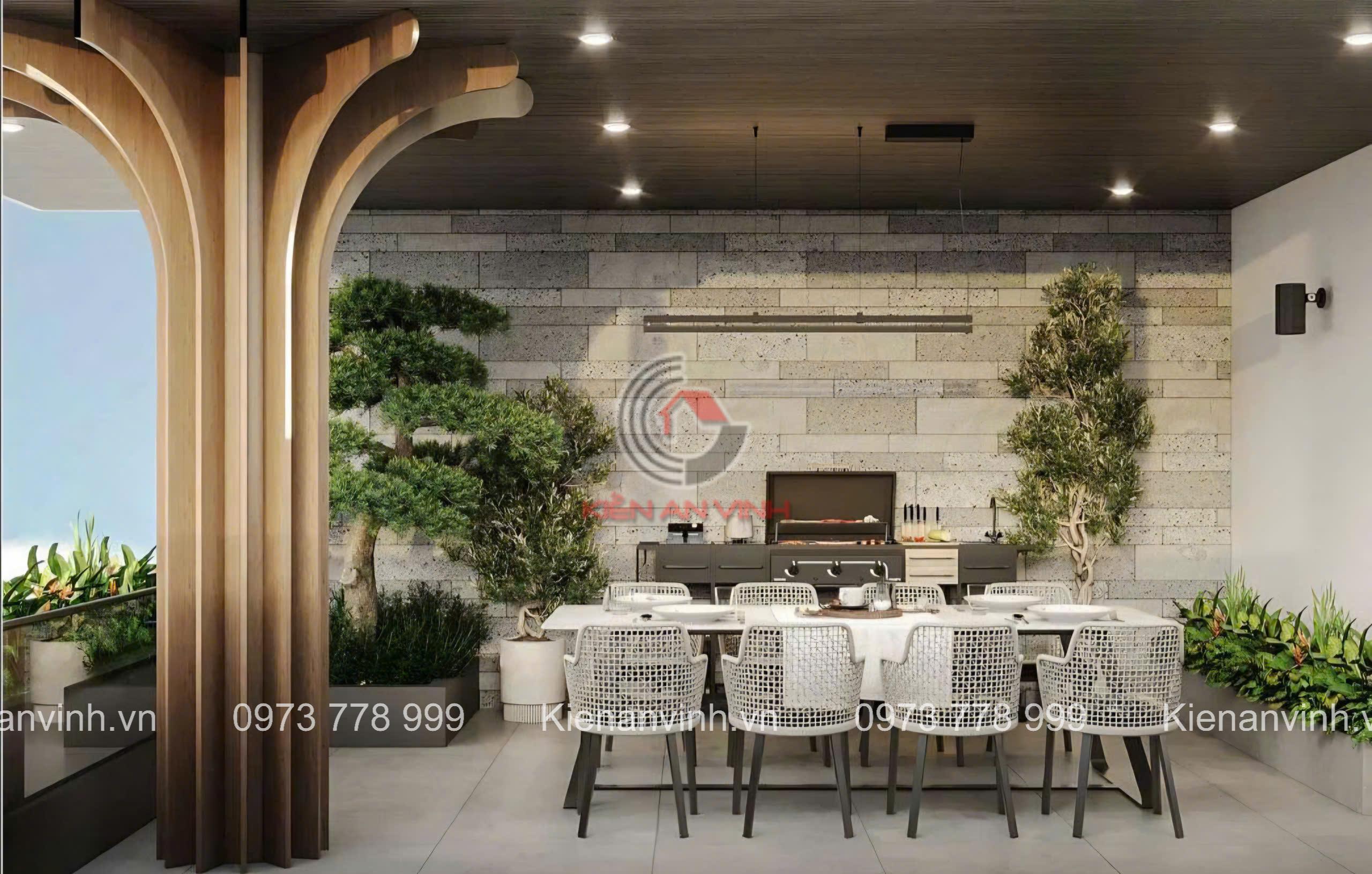 Tầng 3 sở hữu sân thượng 72m² với lan can kính, cây xanh và mái che di động. Đây là nơi lý tưởng để BBQ, yoga hoặc trồng rau sạch, giảm nhiệt độ nhà 5-7 độ C, theo nghiên cứu từ các dự án Kiến An Vinh.