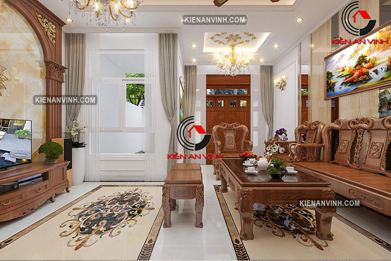 Phòng khách sẽ được trang trí theo phong cách bàn trà bằng gỗ tự nhiên kết hợp với đèn chùm pha lê. Tạo nên không gian ấm cúng nhưng cũng đầy sang trọng. Đi kèm là hệ thống tranh ảnh cũng tôn lên một phòng khách khang trang.