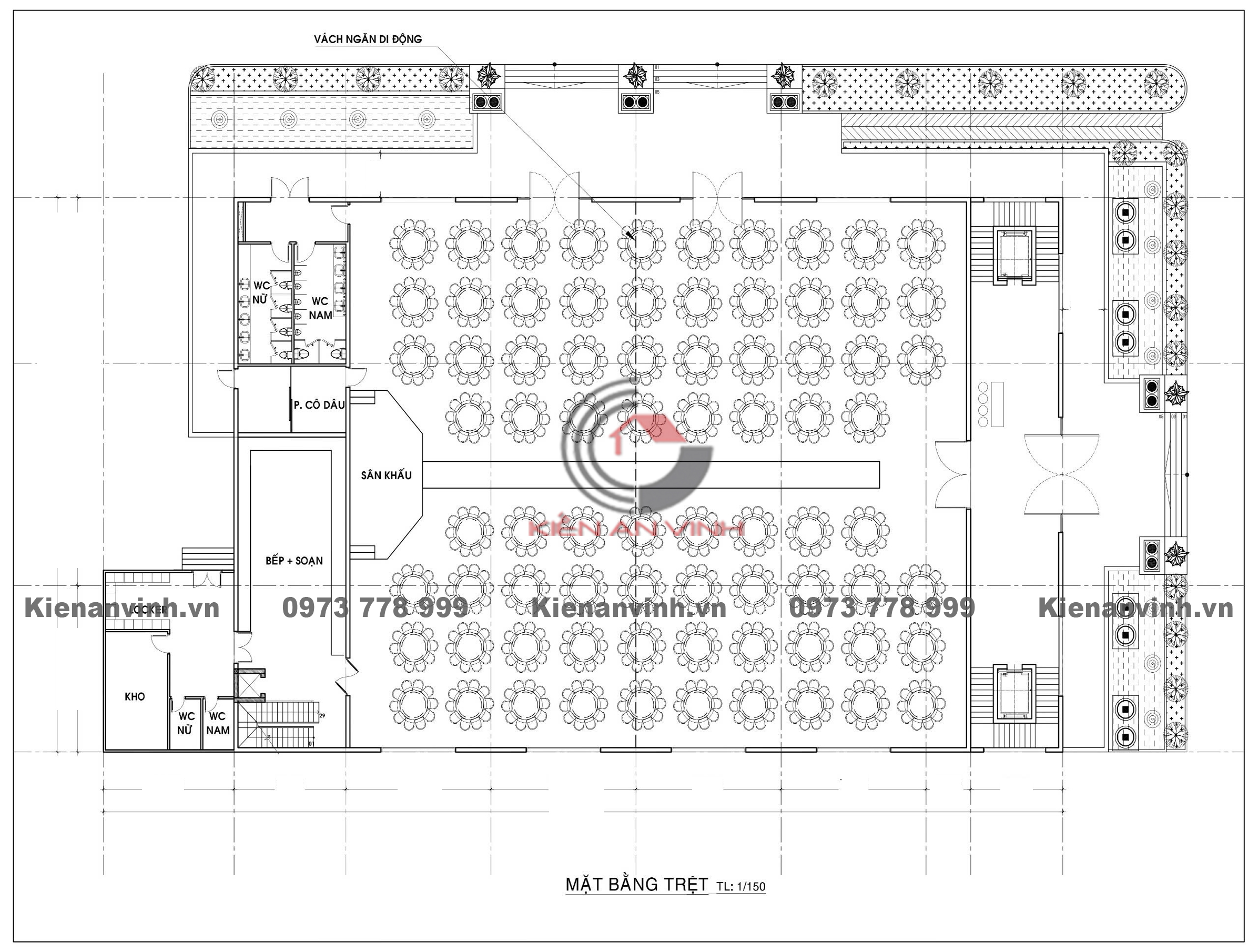 Quy mô: 1 trệt + 1 lầu (nhiều sảnh tiệc, có phương án ngăn phòng linh hoạt)