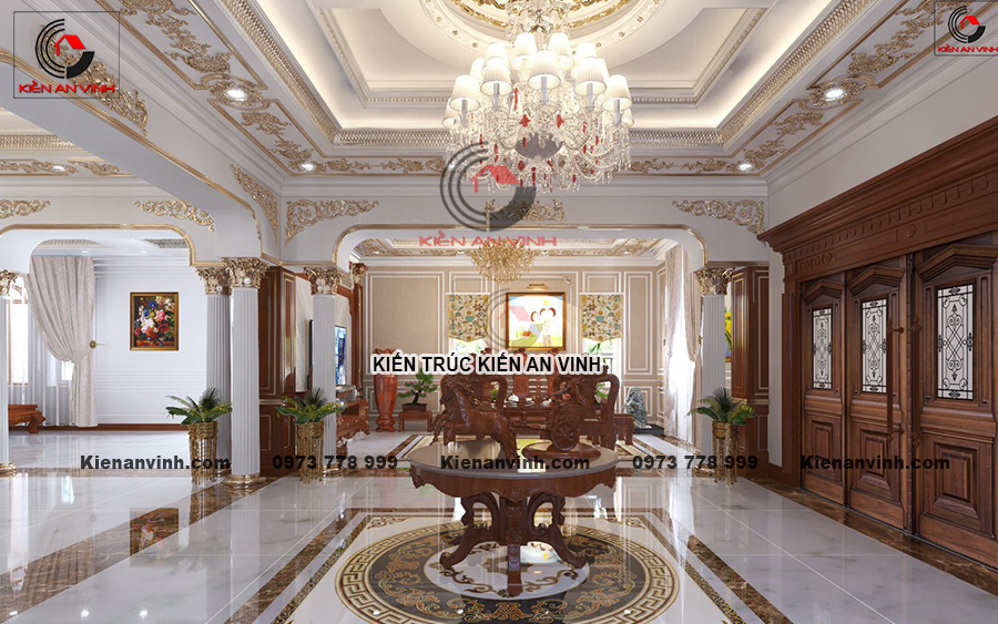 Được xem là mẫu nhà biệt thự 3 tầng tân cổ điển mang quy mô vừa nhưng công năng sử dụng vô cùng tiện nghi. Kiến trúc bên ngoài được đầu tư từ phần chân đế đến mái vô cùng đặc sắc. Mang lại góc nhìn thời thượng về lối sống vương giả của một chủ đầu tư có kinh tế chỉ nằm ở mức khá. Được bố trí phần nền móng cao ráo, vô cùng tiện nghi khi thời tiết bước vào gia đoạn mùa mưa. Vừa tăng khả năng chống ẩm móc, vừa tạo sự cao ráo đầy sang trọng cho biệt thự 3 tầng này.